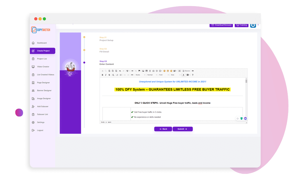 CopySketch creates any copy and content matching your requirements in any niche.